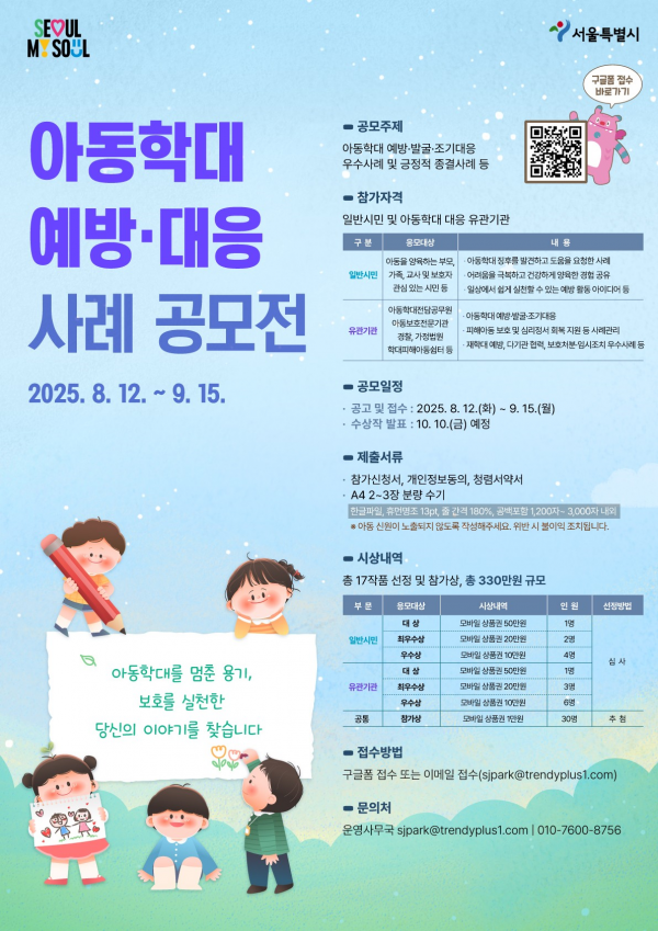 서울시는 아동학대 예방과 효과적인 대응 사례를 발굴하고 공유·확산함으로써 아동학대에 대한 시민과 유관기관의 관심을 높이기 위한 ‘아동학대 예방·대응 사례 공모전’을 개최한다고 밝혔다.