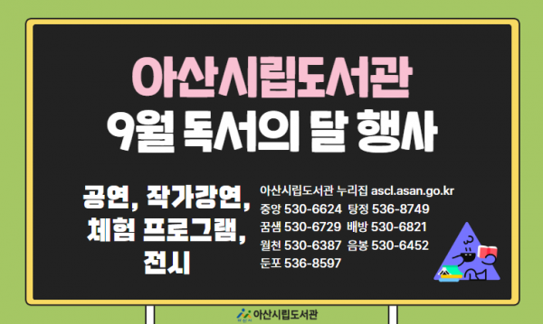 [충청뉴스큐] 아산시립도서관은 9월 ‘독서의 달’을 맞아 시민들이 책과 도서관을 더욱 가까이 느낄 수 있도록 다양한 프로그램을 마련한다.