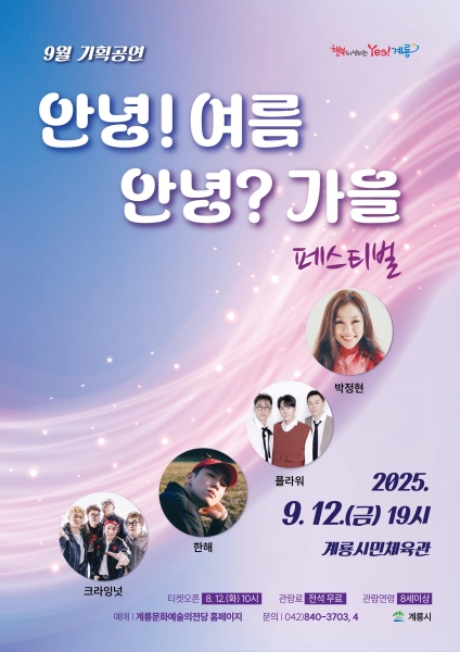[충청뉴스큐] 계룡시는 오는 9월 12일 오후 7시 계룡시민체육관에서 ‘안녕여름 안녕?가을 페스티벌’ 을 개최한다.
