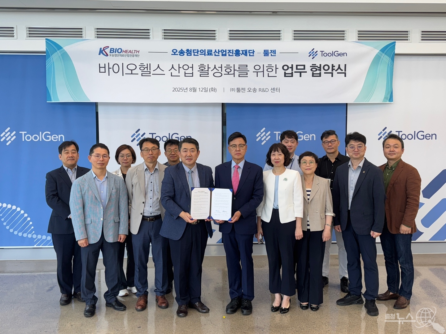 오송첨단의료산업진흥재단(KBIOHealth·이사장 이명수)은 세계 최고 수준의 유전자교정 전문기업인 툴젠(ToolGen·대표이사 유종상) 과 12일툴젠 오송R&D센터 대회의실에서 신약개발 연구협력을 위한 업무협약(MOU)을 체결했다고 밝혔다.