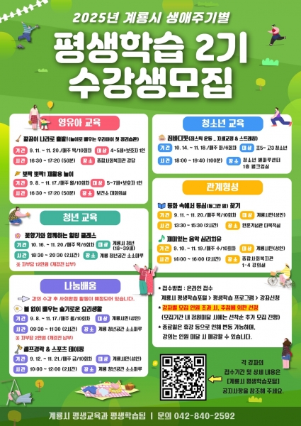 [충청뉴스큐] 계룡시는 오는 9월부터 11월까지 3개월간 ‘2025년 2기 생애주기별 맞춤형 평생학습 프로그램’을 운영한다고 밝혔다.