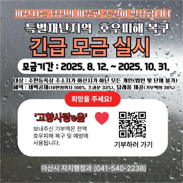 행정안전부는 이에 따라 지난 6일 아산시에 대해 ‘특별재난지역’을 선포했고 아산시는 이에 대응해 호우피해 복구 및 예방을 위해 고향사랑기금 지정사업 긴급모금을 실시한다.