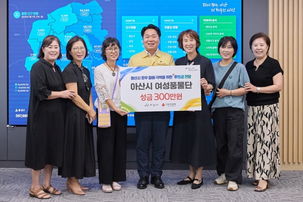 [충청뉴스큐] 아산시는 13일 여성풍물단으로부터 최근 집중호우로 피해를 입은 지역 주민들을 돕기 위한 성금 300만원을 전달받았다고 밝혔다.