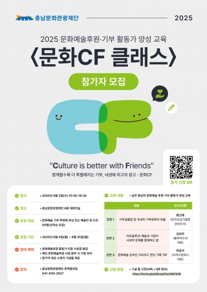 [충청뉴스큐] 충남문화관광재단은 지역 문화예술 후원문화를 확산하고 지속 가능한 후원 생태계를 조성하기 위해 문화예술후원 활동가 양성 프로그램 ‘문화CF 클래스’ 참가자를 모집한다.
