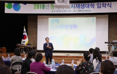 [충청뉴스큐] 평택시는 지난달 31일 정장선 평택시장과 평택시의회 김승겸 산업건설 위원장, 입학생과 관계자 등 100명이 참석한 가운데 ‘2019년 제 5회 평택시 도시재생대학 입학식’을 개최했다.평택시는 시민들에게 시에서 추진하고 있는 도시재생사업과 뉴딜정책에 대한 이해를 돕고자 2015년부터 매년 도시재생대학을 운영하고 있다.