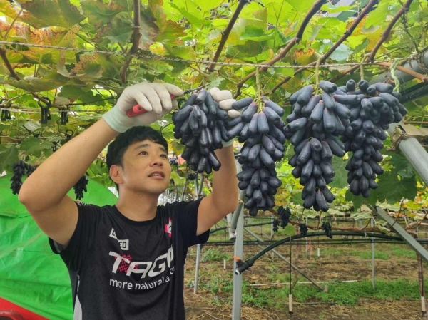 [충청뉴스큐] 예산군은 당도 높고 식감이 뛰어난 블랙사파이어 포도가 올해 첫 출하를 시작했다고 13일 밝혔다.