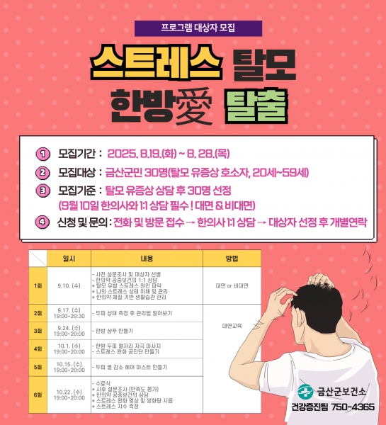 [충청뉴스큐] 금산군보건소는 스트레스로 인한 탈모 증상을 겪는 군민을 대상으로 한방 건강증진 프로그램 ‘2025년 스트레스 탈모 한방애 탈출’ 프로그램 참여 대상자를 19일부터 오는 28일까지 모집한다.