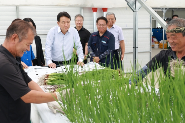 김영환 충북도지사, 보은군 양념채소 스마트팜 첫 수확 현장 방문