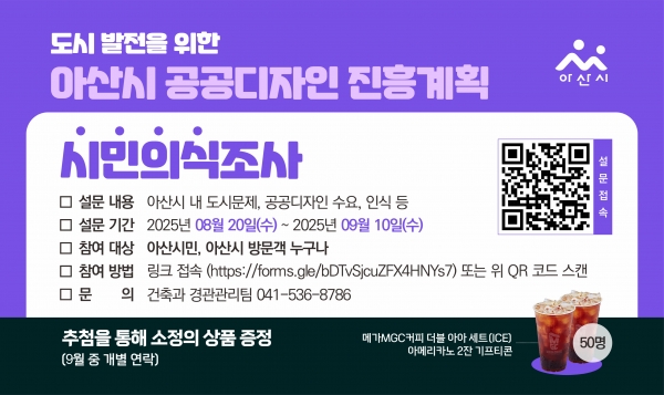 이강헌 아산시 건축과장은 “공공디자인은 시민들이 일상에서 마주하는 생활환경과 직결된다”며 “시민 한 분 한 분의 의견이 아산 도시 미래를 바꾸는 원동력이 되는 만큼, 많은 시민 여러분의 적극적인 참여를 부탁드린다”고 전했다.
