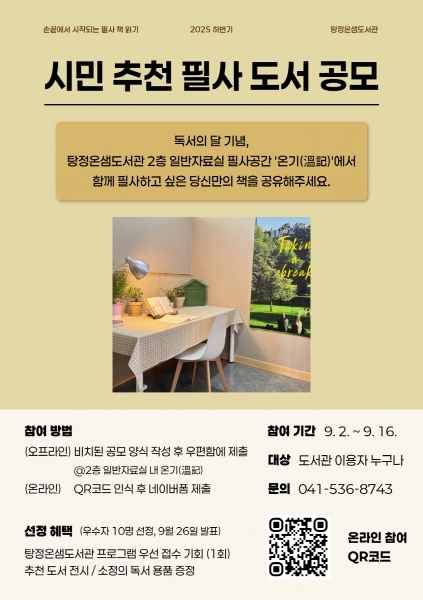 [충청뉴스큐] 아산시 탕정온샘도서관이 독서의 달을 맞아 ‘시민 추천 필사 도서 공모’를 진행한다.