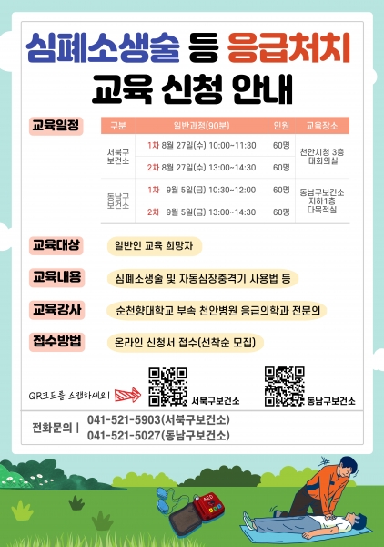 교육은 오는 8월 27일 천안시청 3층 대회의실과 9월 5일 동남구보건소 지하 1층 다목적실에서 오전 10시와 오후 1시에 진행되며 회당 60명씩 총 240명이 참여할 수 있다.