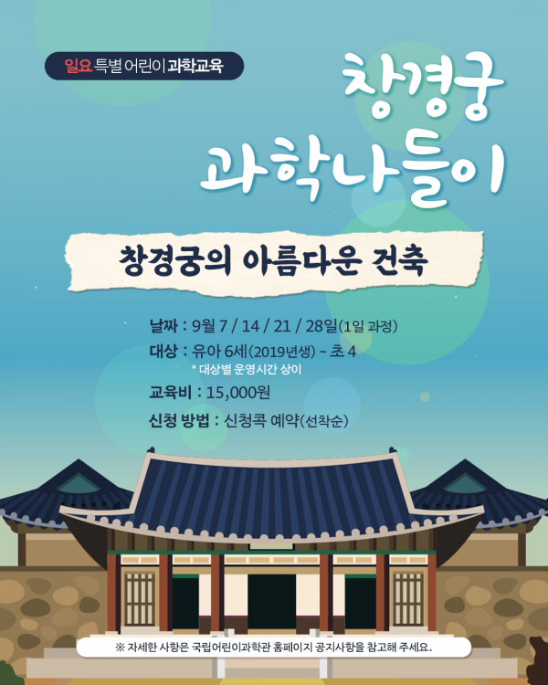 9월에는 과학관 어린이교실에서 궁궐 건축물 교육과 단청 무늬 컵받침 만들기 활동을 진행하고 창경궁으로 이동해 홍화문과 옥천교를 건너 명정전, 문정전, 경춘전 및 통명전 등을 탐방한다.