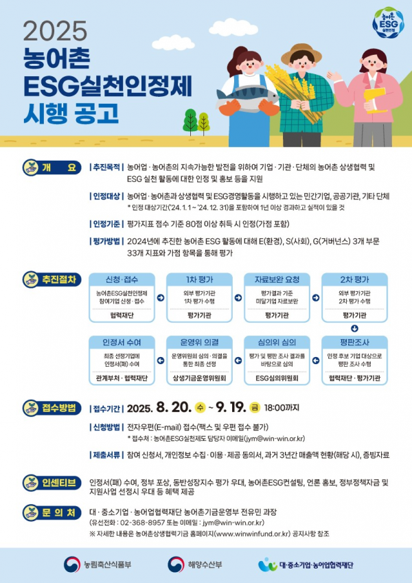 [충청뉴스큐] 해양수산부, 농림축산식품부, 대·중소기업·농어업협력재단은 농어촌 환경·사회·거버넌스 활동에 기여한 우수 기업·기관을 인정하고 홍보하기 위한 ‘2025년 농어촌 ESG 실천인정제’를 시행한다고 밝혔다.