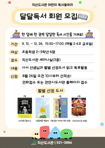 [충청뉴스큐] 천안직산도서관은 오는 9월 12일~ 12월 26일 어린이 독서동아리 ‘달달독서’를 운영한다고 21일 밝혔다.
