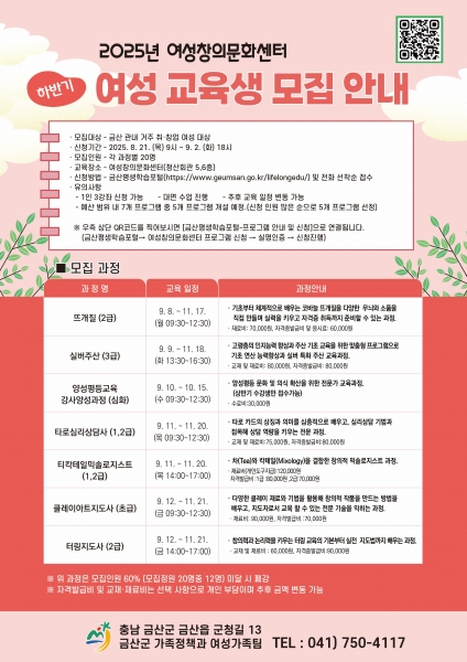 [충청뉴스큐] 금산군은 지역 여성들의 취업 역량을 강화하고 창업 기회를 확대하기 위해 2025년 하반기 취·창업 교육 프로그램을 9월부터 11월까지 여성창의문화센터에서 운영한다.