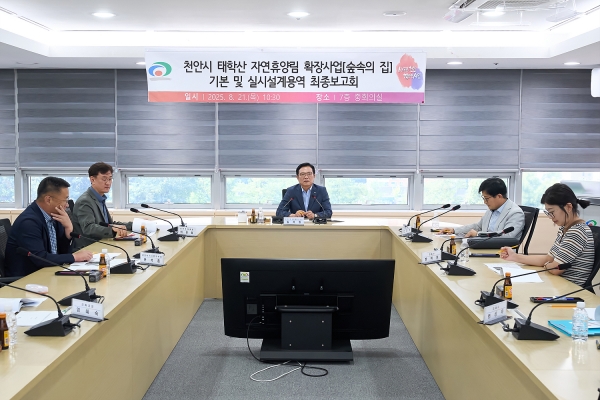 [충청뉴스큐] 천안시는 지난 21일 시청 중회의실에서 ‘태학산 자연휴양림 숲속의 집 확장사업 기본 및 실시설계최종 보고회’를 개최했다.