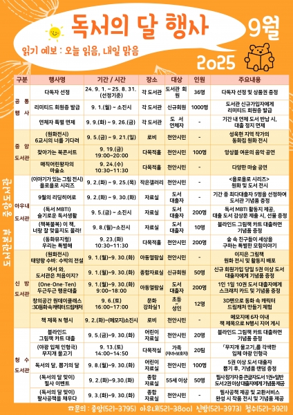 [충청뉴스큐] 천안시도서관은 오는 9월 ‘독서의 달’을 맞아 다양한 독서문화 프로그램을 운영한다고 25일 밝혔다.