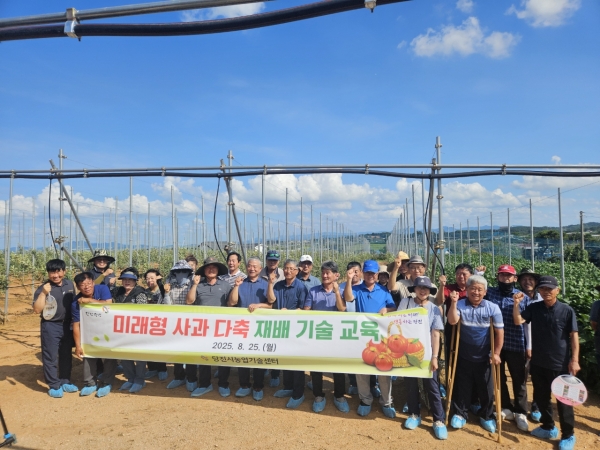 [충청뉴스큐] 당진시농업기술센터는 지난 25일 관내 사과 농가 및 희망자를 대상으로 미래형 사과 다축 재배 기술 이론 및 현장 교육을 추진했다고 26일 밝혔다.