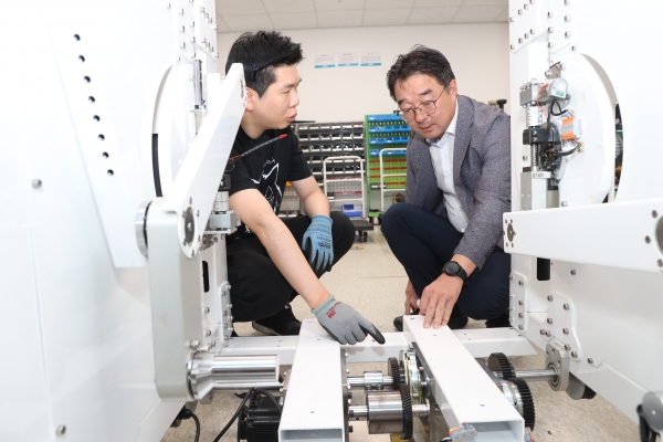 [충청뉴스큐] 조달청 강희훈 신성장조달기획관이 26일 세종에 위치한 재활로봇기업 휴가시스템을 방문해 혁신제품 제조과정을 살펴보고 있다.