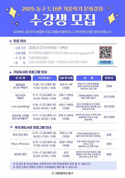 [충청뉴스큐] 대전 동구는 다음 달부터 12월까지 운영되는 ‘2025년 도서관 가을학기 문화강좌’ 수강생을 모집한다고 27일 밝혔다.