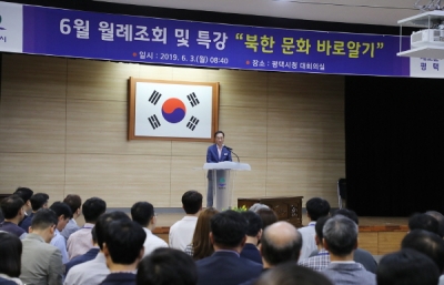 [충청뉴스큐] 평택시가 지난 3일 특강 ‘북한 문화 바로알기’라는 이색적인 주제로 6월 월례조회를 개최해 참석한 직원들로부터 좋은 호응을 얻었다.