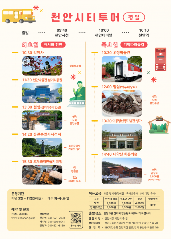 오는 11월까지 운영되는 시티투어는 화·목·토·일요일 주 4회 운행하며 각 코스별로 역사, 체험, 자연, 과학 등 천안의 다양한 매력을 담았다.