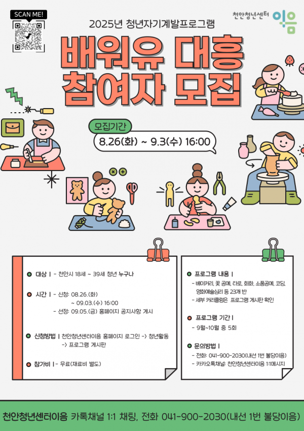 [충청뉴스큐] 천안시는 다음 달 3일까지 청년 자기계발프로그램 ‘배워유’ 참여자를 모집한다고 28일 밝혔다.