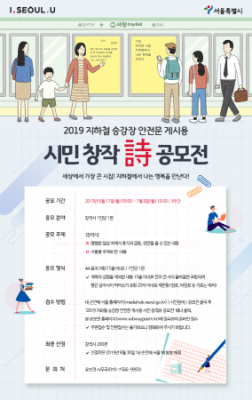 ‘지하철 승강장 안전문 게시용 시’는 지난 2011년부터 시민 공모를 통해 천만 서울시민에게 지하철을 기다리는 잠깐의 시간 동안 따뜻한 위로와 희망의 메시지를 건네는 좋은 작품들을 게시해왔다. 올해도 바쁜 일상을 살아가는 지하철 이용 시민들의 지친 마음을 위로해 줄 ‘시민 시인’들의 새로운 작품을 기다린다.