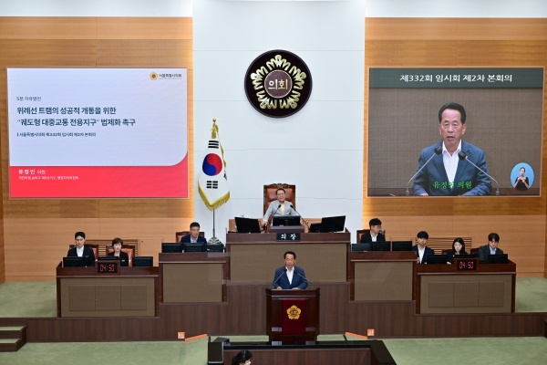 [충청뉴스큐] 서울특별시의회 유정인 의원은 8월 28일 제332회 임시회 본회의 5분 자유발언을 통해, 위례선 트램의 성공적 개통과 안전한 정착을 위해 ‘궤도형 대중교통 전용지구’ 지정 및 법제화가 반드시 필요하다고 강력히 촉구했다.