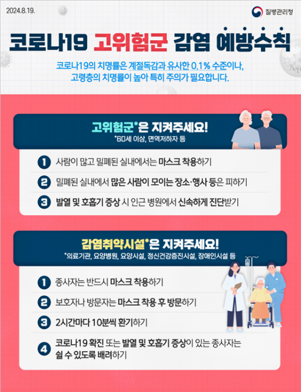 임승관 질병관리청장은 “여름철 코로나19 확산세가 아직까지 지속되고 있다” 며 “코로나19 감염 시 중증으로 진행될 위험이 큰 고령층의 어르신이나 면역저하자 등 고위험군은 코로나19 감염 예방을 위해 사람이 많이 모이는 행사 참여를 자제하고 밀폐된 실내에서는 마스크를 착용해야한다”고 전했다.