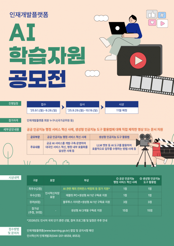 인사혁신처는 공무원의 인공지능 활용 역량을 높이고 공직 내 학습 문화를 확산하기 위해 ‘인재개발플랫폼 인공지능 학습자원 공모전’을 개최한다고 1일 밝혔다.