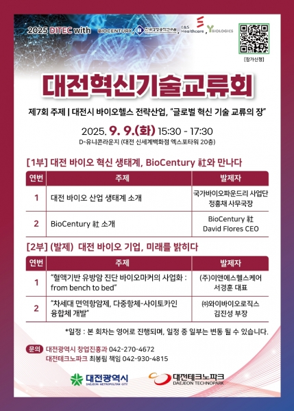 [충청뉴스큐] 대전시는 9월 9일 대전신세계 엑스포타워 20층 D-유니콘라운지에서 ‘제7회 대전혁신기술교류회’를 개최한다.
