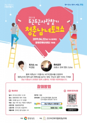 [충청뉴스큐] 경상남도가 인구보건복지협회 경남지회와 공동으로 경남 미혼남녀를 대상으로 ‘두근두근 사랑찾기 청춘남녀 토크쇼’를 오는 22일 창원 CECO에서 실시한다.