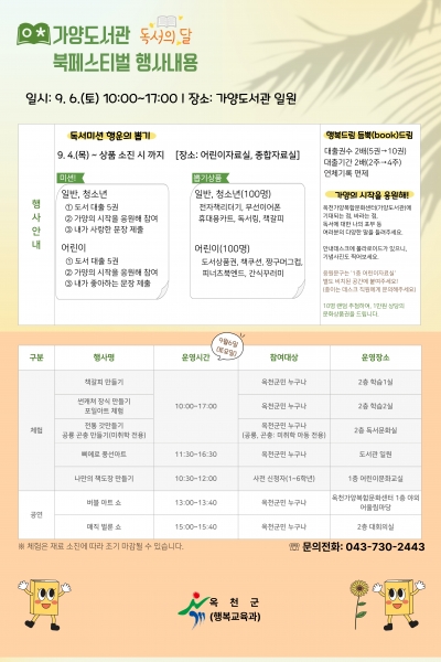 [충청뉴스큐] 오는 9월 4일 개관하는 옥천가양복합문화센터에서는 독서의 달을 맞아, 9월 6일 오전 10시부터 오후 5시까지 ‘북-페스티벌’을 개최한다.