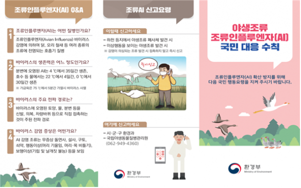 조류인플루엔자 폐사체 또는 의심개체가 발견되면 신속한 방역조치 등을 위해 관할 지자체와 국립야생동물질병관리원으로 즉시 신고하도록 절차를 개선했다.