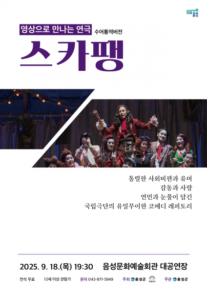 ‘영상으로 만나는 연극 ‘스카팽’’은 국립극단에서 제작해 지난 2020년 10월 25일 명동예술극장에서 진행된 연극 ‘스카팽’ 실황을 촬영한 영상물로 음성문화예술회관 무대의 대형 스크린에서 사실감 넘치게 상영될 예정이다.