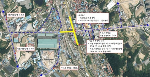 통제 구간은 옥천읍 대천리 422-10번지 마암 과선교에서 옥천읍 마암리 62번지 국도 4호선까지이며 특히 접속부 구간인 국도 4호선은 공정에 따라 왕복 4차로 중 2차로가 부분 통제될 예정이다.