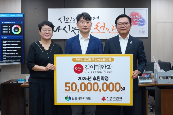 [충청뉴스큐] 천안시복지재단은 지난 8일 김이태 안과가 천안시청 부시장실에서 사회적 고립가구 지원을 위한 후원금 5,000만원을 약정했다고 밝혔다.