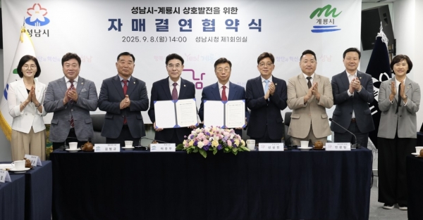 [충청뉴스큐] 계룡시와 경기도 성남시가 8일 성남시청에서 우호 교류 증진과 상호 발전 자매결연 협약을 체결했다고 밝혔다.