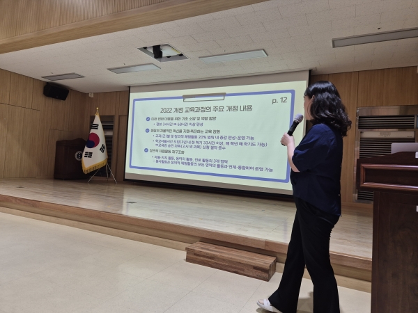 연수 주요 내용으로는 2022 개정 교육과정의 이해 및 학교 현장 적용 방안 안내, 2026학년도 중학교 입학생 교육과정 편성·운영 방안, 학교자율시간 운영 및 교육감 승인 과목 개설 절차와 사례 소개, 질의응답을 통한 현장의 실천적 고민과 대안 모색으로 구성됐다.