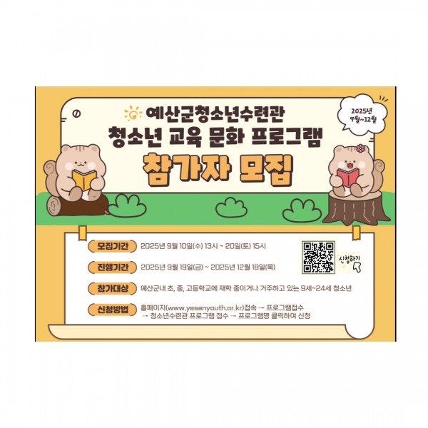 [충청뉴스큐] 예산군청소년수련관은 관내 청소년들의 건강한 성장 지원과 미래 사회 대비를 위해 마련된 2025년 4분기 청소년 프로그램 참가자를 9월 10일 오후 1시부터 20일 오후 3시까지 모집한다고 밝혔다.