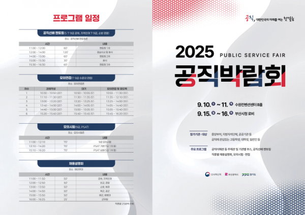인사혁신처는 ‘2025 공직박람회’를 오는 11일까지 수원컨벤션센터와 오는 15~16일 부산시청에서 각각 개최한다고 10일 밝혔다.