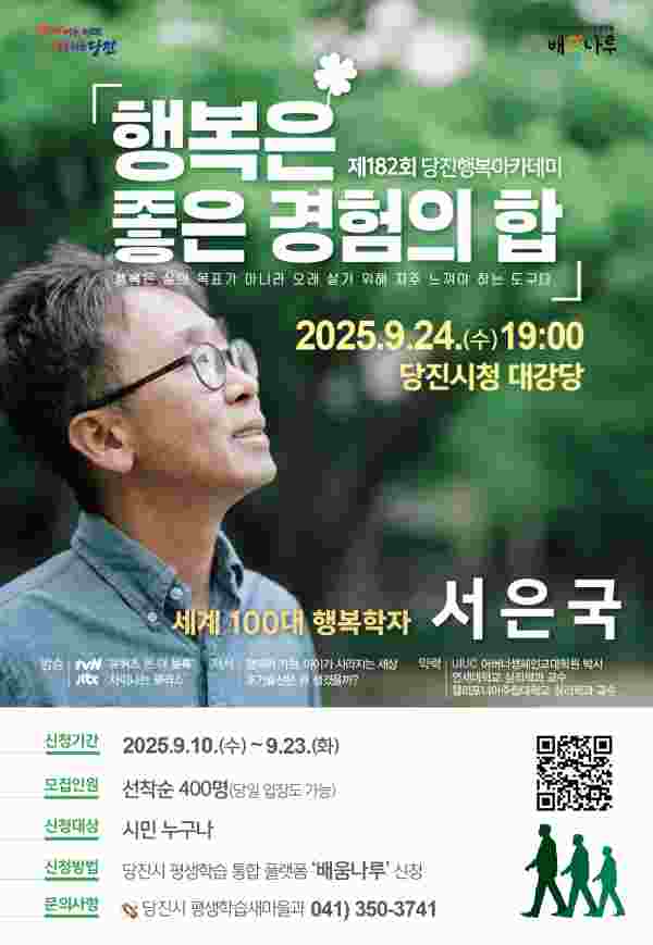 제182회 당진행복아카데미에 참석을 원하는 시민은 당진시평생학습플랫폼 ‘배움나루’를 통해 23일 오후 6시까지 사전 신청할 수 있으며 선착순으로 400명까지 모집한다.