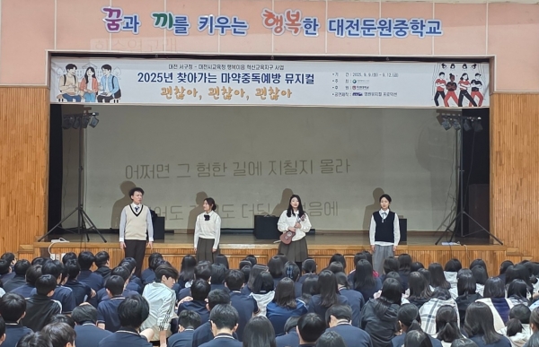 [충청뉴스큐] 대전 서구는 이달 9일부터 12일까지 진행된 ‘마약·사이버 범죄 예방 뮤지컬’를 끝으로 올해 ‘찾아가는 학교폭력 및 마약 중독 등 예방 뮤지컬’ 일정을 성황리에 마쳤다고 15일 밝혔다.