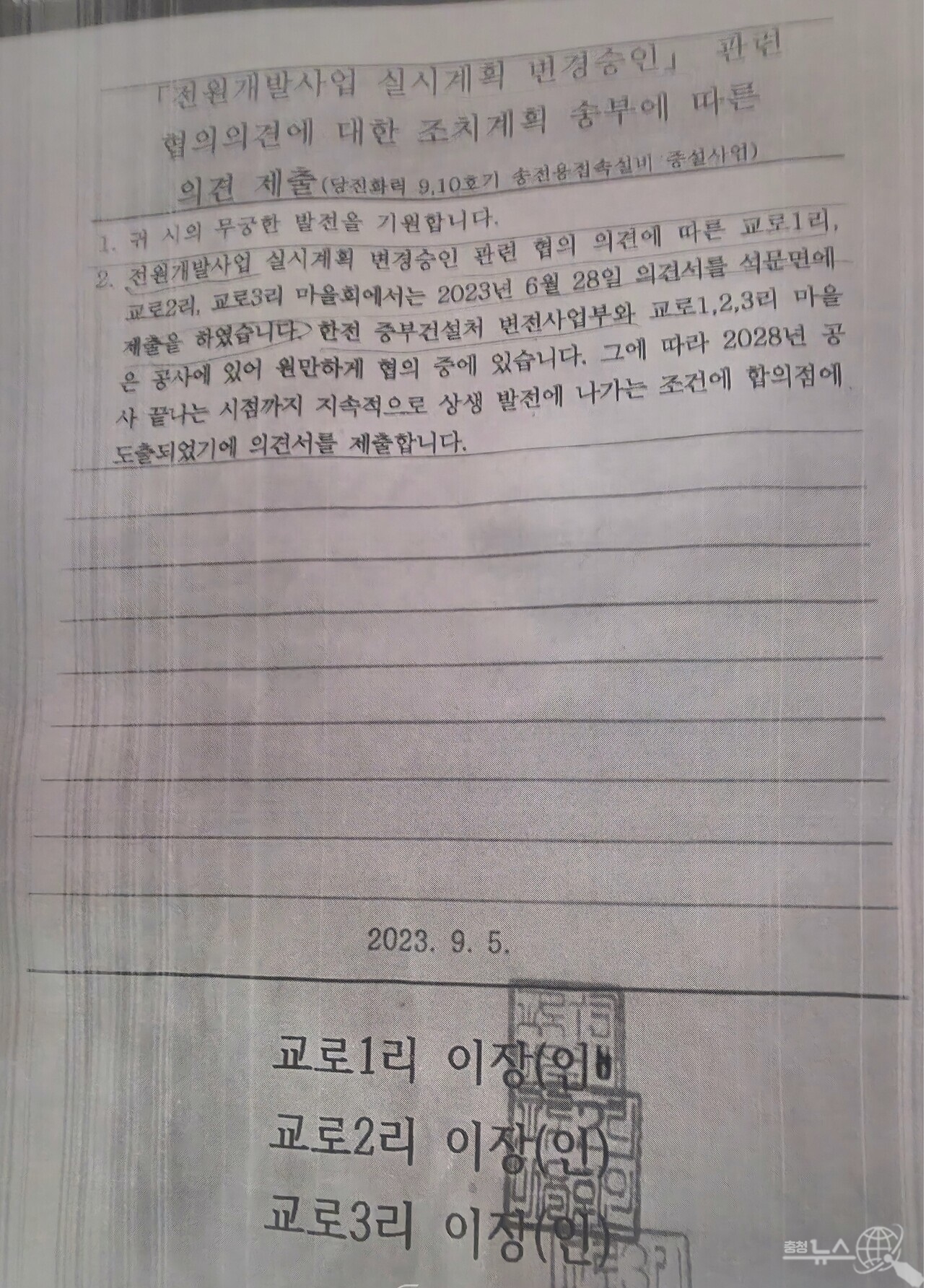 A 씨가 감사 부서에 민원을 제기한 후 받은 자료는 '딸랑 종이 한 장', 그 서류에는 2023년 6월 28일 교로1·2·3리 이장들이 한전 중부건설처 변전사업부와 '상생 발전'을 조건으로 공사에 합의했다는 내용이 담겼지만, 정작 주민들은 합의 사실조차 모르고 있었다.