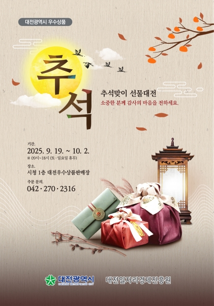 [충청뉴스큐] 대전시는 민족 최대의 명절 추석을 앞두고 지역 우수 상품을 널리 알리고 지역경제 활성화에 기여하기 위해 9월 19일부터 10월 2일까지 10일간 시청 1층 대전우수상품판매장에서 ‘추석맞이 선물대전’을 연다.