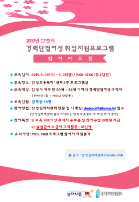 본 프로그램은 오는 26일부터 28일까지 3일간 1일 4시간씩 안성고용복지플러스센터 3층에서 진행되며, 안성시에 거주하는 1965년생에서 1999년생의 여성구직자라면 누구나 신청 가능하다. 다만, 2017년 2018년 프로그램참여자는 지원이 제외된다.