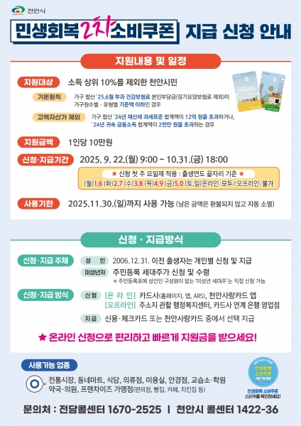 2차 민생회복 소비쿠폰은 소득 상위 10%를 제외한 천안시민에게 1인당 10만원씩 지급된다.