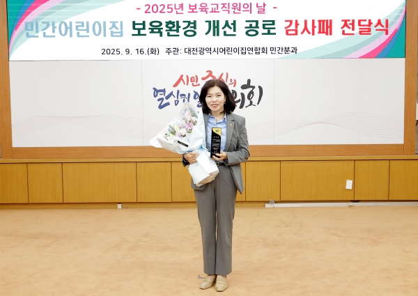[충청뉴스큐] 대전광역시의회 이금선 교육위원장은 지난 9월 16일 민간 어린이집 보육환경 개선과 보육 교직원 권익 증진에 기여한 공로로 감사패를 받았다고 밝혔다.