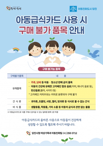 [충청뉴스큐] 당진시는 아동급식카드의 투명하고 원활한 운영을 위해 아동급식카드 대상자 589명, 관내 아동급식 가맹점 40개소에 ‘아동급식카드 사용 시 구매 불가 품목 안내문’을 배포했다고 17일 밝혔다.
